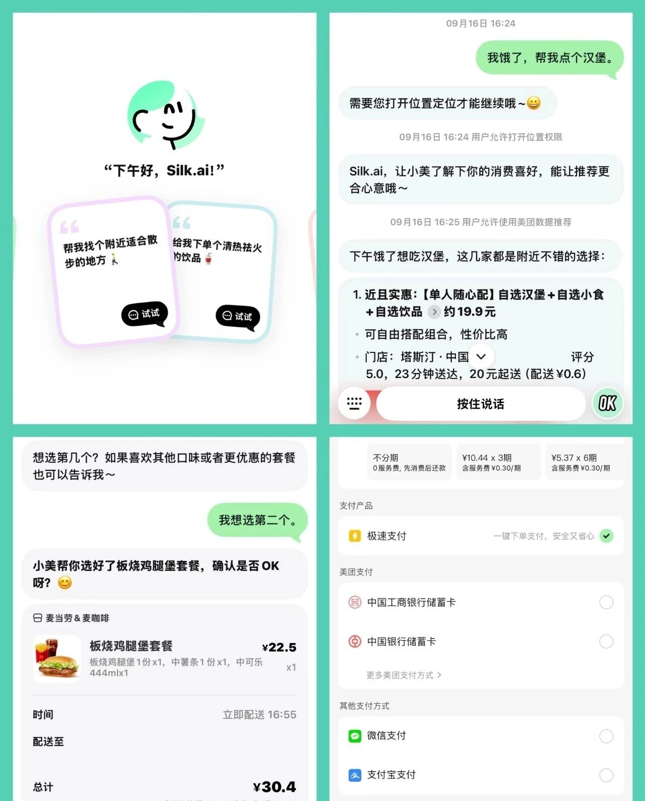 我让小美帮忙点了个汉堡,她先是稍作思考,随后调用美团外卖服务,推荐合适的餐厅,再跟我确认;等我选定餐厅后,小美会自动跳转至支付页面。值得一提的是,她还能帮我使用优惠券,我也可以继续添加其他菜品。