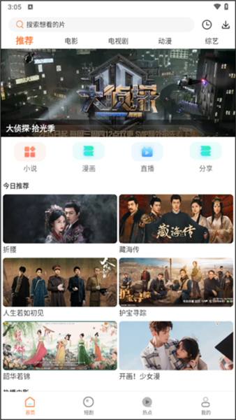 1、在软件首页,我们能够看到推荐、电影、电视剧、动漫、综艺等一系列板块。
