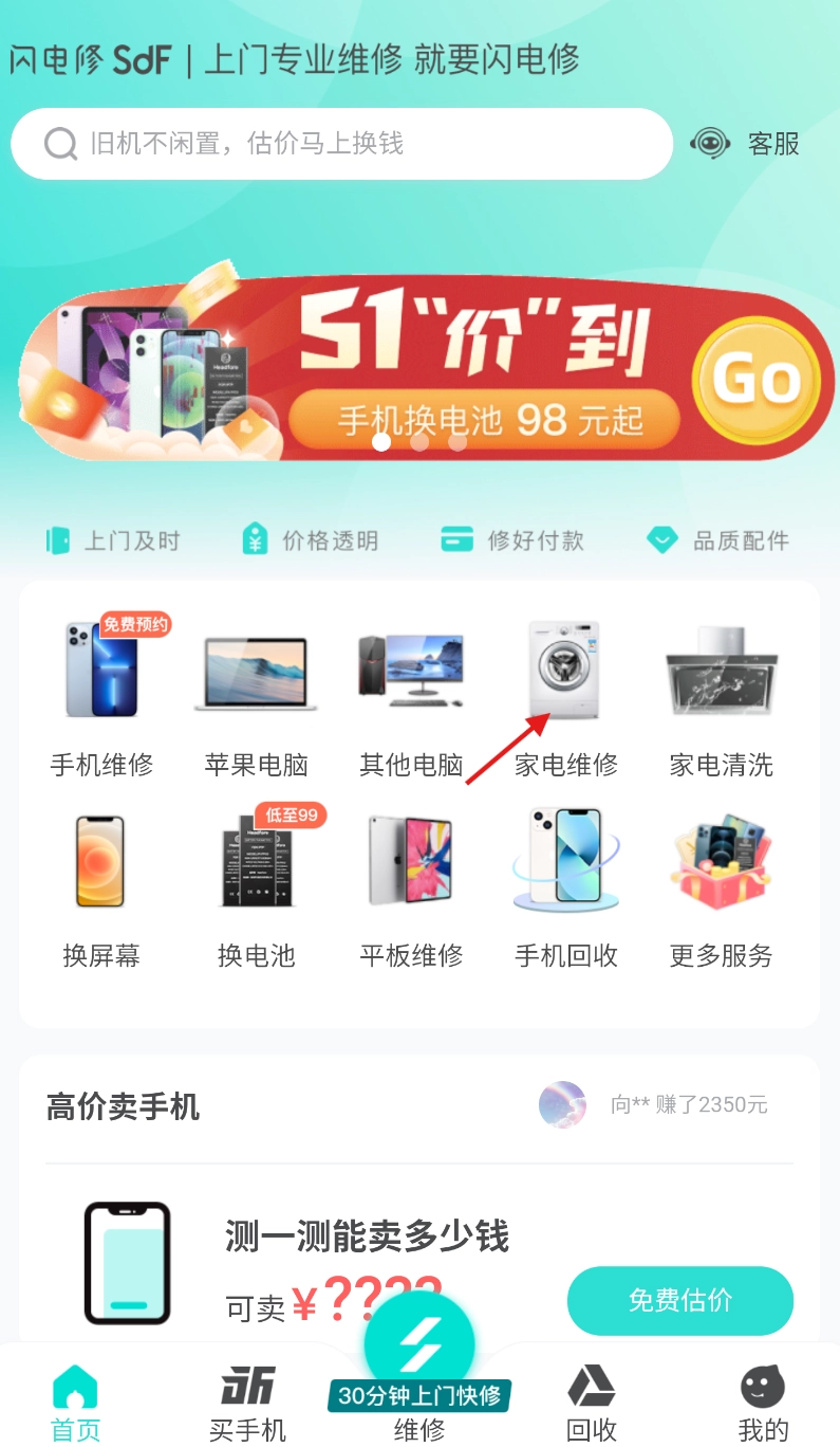 打开闪电修APP进入首页,找到并点击“家电维修”选项,即可进入家电维修服务页面。
