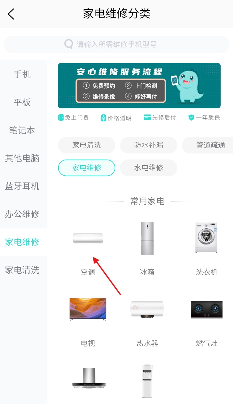 在家电维修分类服务页面的“常用家电”分类里,找到“空调”类别并点击选择。
