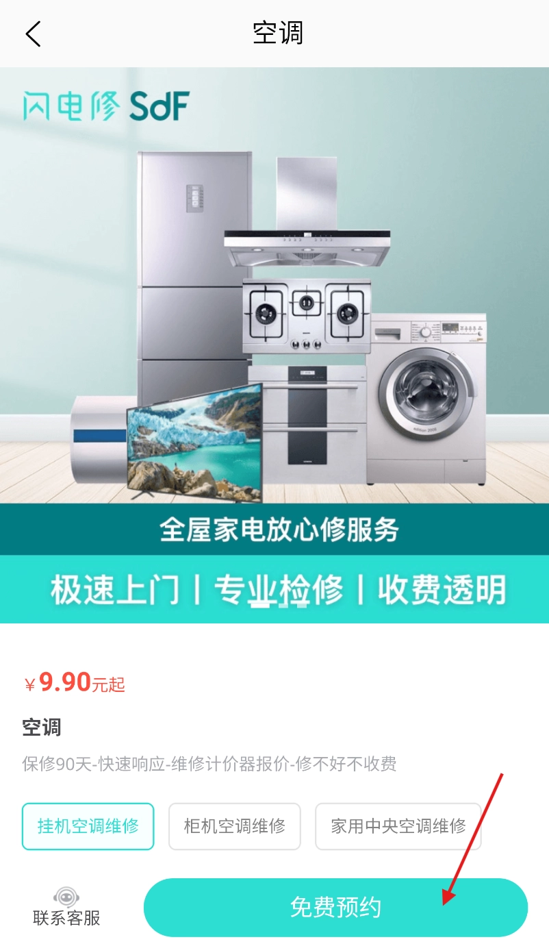 进入空调维修界面后,先确认好服务相关信息,接着点击“免费预约”按钮,这样就能完成空调维修的预约流程了。