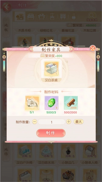 掌柜获取家具的途径包括参与活动、自行制作等;制作家具时会消耗木板,而木板可由农场种植产出。若要制作高品质家具,则需额外消耗图纸与玉石——图纸可从商店购买,玉石则通过商会投资玩法获取。