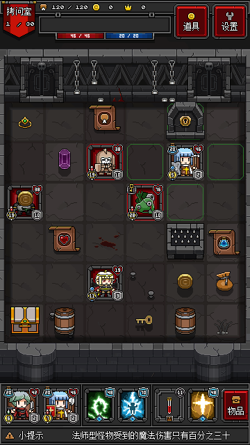 在副本中我们可以看到怪物出现,我们可以通过点击地板上空白区域进行移动,但是有怪物在的时候,我们每一次只能移动一格。进迷你地下城主界面是的,手机像素像素风可爱,这里的像素就很精巧了,屏幕看上去也相当显眼了。