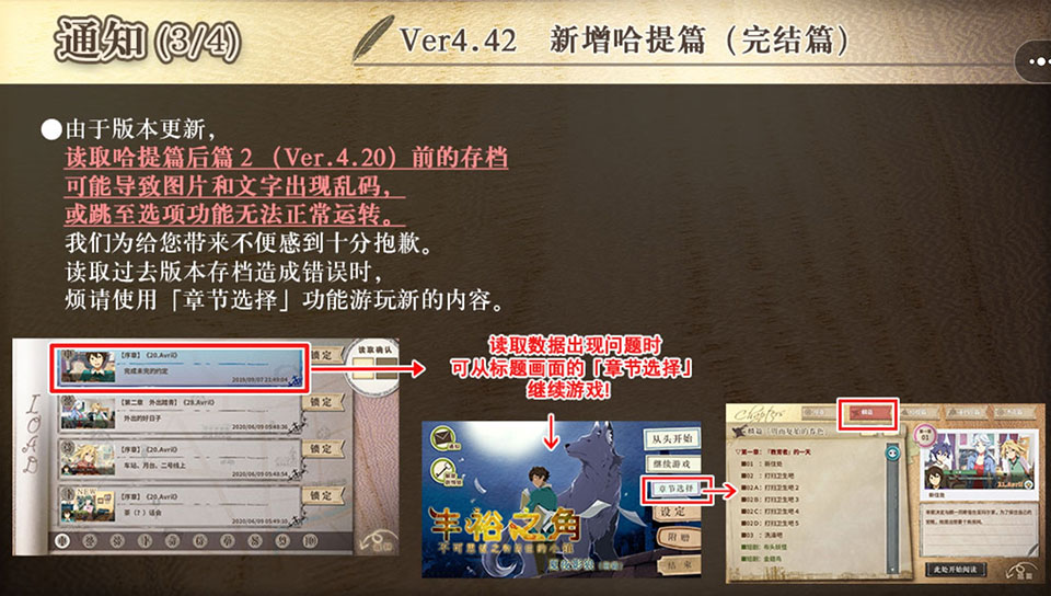 3、版本更新后,读取哈提篇后篇1之前(Ver.4.10)的存档,可能会导致图片和文字混乱。十分抱歉为您带来了不便。读取过去版本的存档,发生故障时,请从【章节选择】界面游玩后续部分。