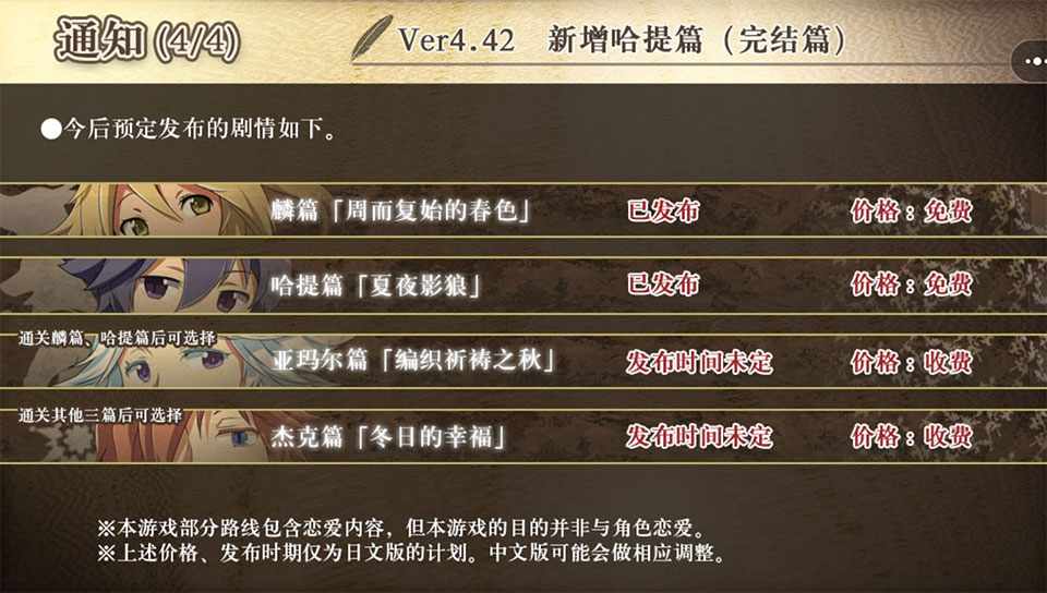 4、以目前v4.20版本来看,麟篇已经完结,并可免费体验全部内容;哈提篇正处于陆续发布阶段,发布完成后也可免费体验全部内容;而亚玛尔篇、杰克篇则正处于未来的更新计划中,发布时间未定,日文版可能会对这两个章节采取收费模式,中文版的话可能会作一定调整。