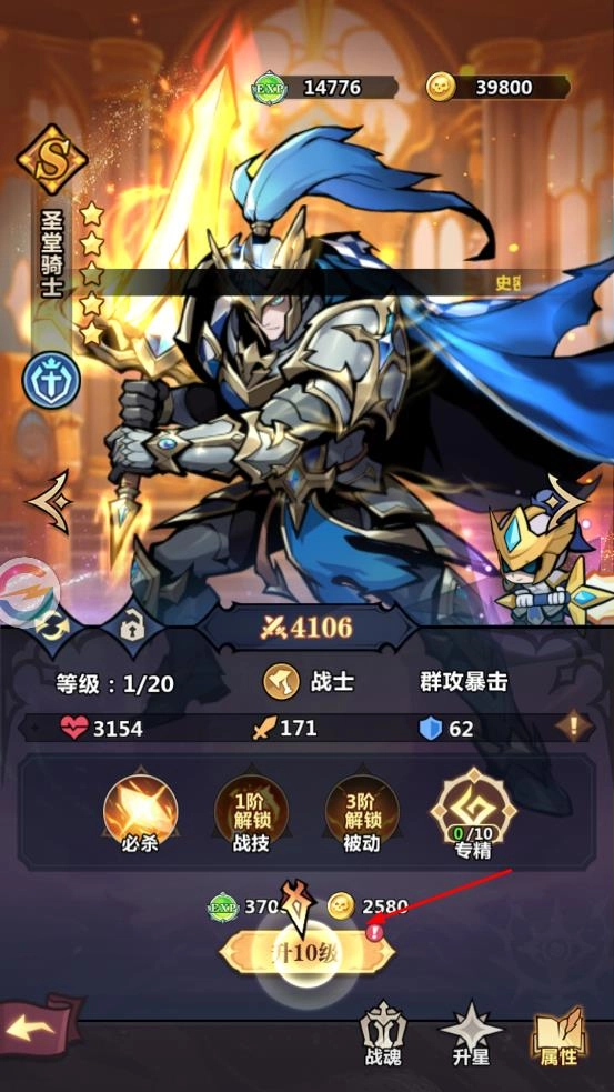 进入英雄界面后,消耗金币之类的资源对英雄进行升级,比如将圣堂骑士提升至10级,以此解锁战技、被动等相关能力。