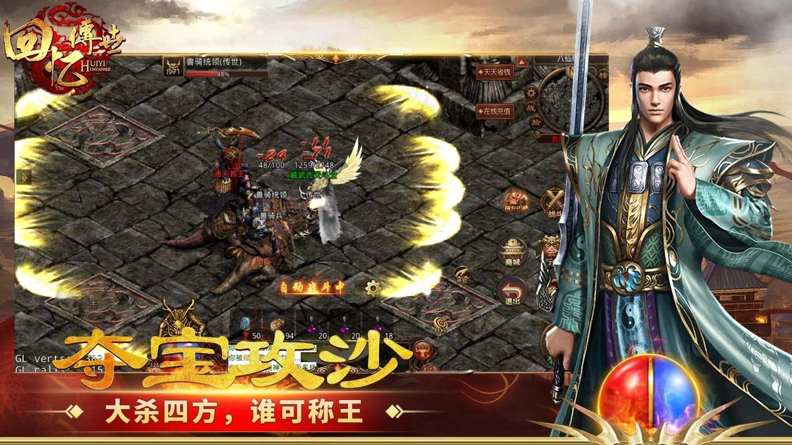 回忆传世游戏是一款十分经典的传奇服,装备和技能全部由怪物掉落,玩家能从中体验到与怪物搏斗、爆出装备以及和boss群战的乐趣。