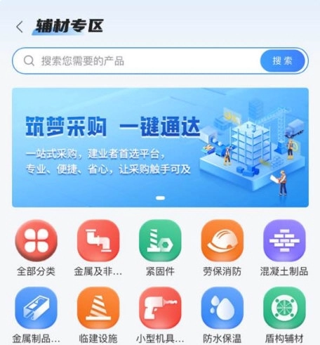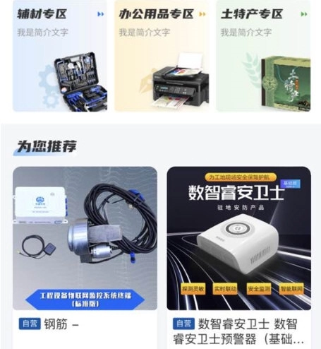 平台为用户划分了商品专区分类,涵盖辅材专区、办公用品专区等不同类别的商品。