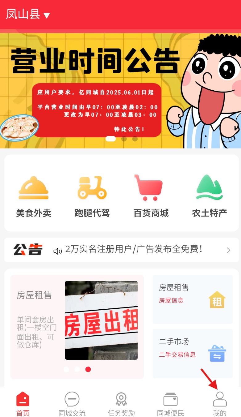打开亿同城应用后,在主界面底部的菜单栏里找到“我的”选项并点击它。