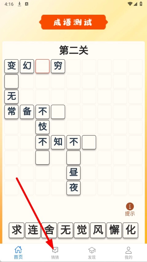 打开软件后,点击底部导航栏里的“猜猜”选项,即可进入看图猜成语的功能界面。