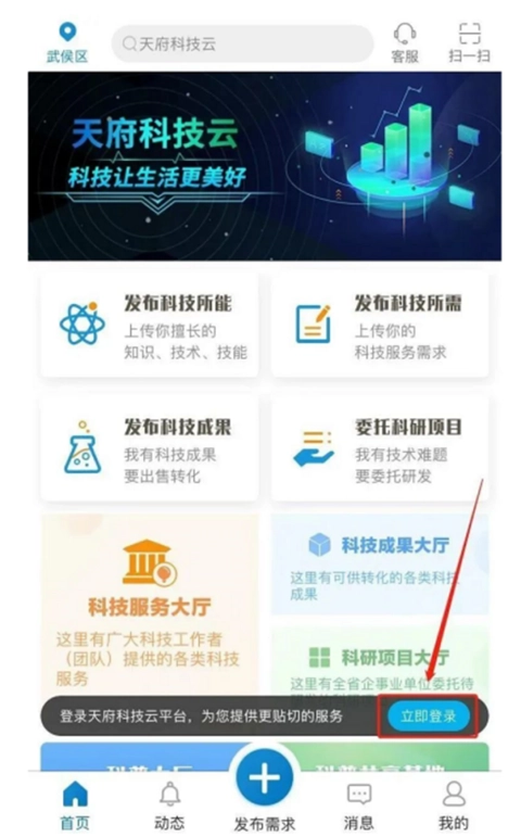 一、打开天府科技云,点击界面下方的“立即登录”按钮,就能进入登录或注册的页面。