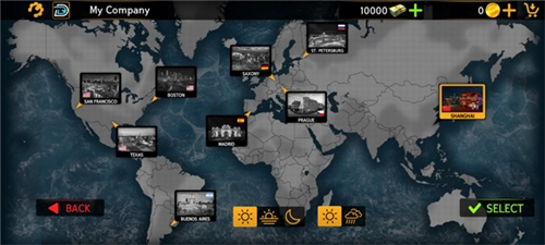 你可以选择自己想去的地区,游戏里包含多种现实中的城内与城外地图,比如美国的旧金山和德克萨斯、南美洲的布宜诺斯艾利斯、欧洲的德国、西班牙、布拉格、圣彼得堡,还有迪拜、上海等地。另外,你能在下方挑选当前地区一天里的不同时间以及天气状况,点击SELECT按钮就可以了。
