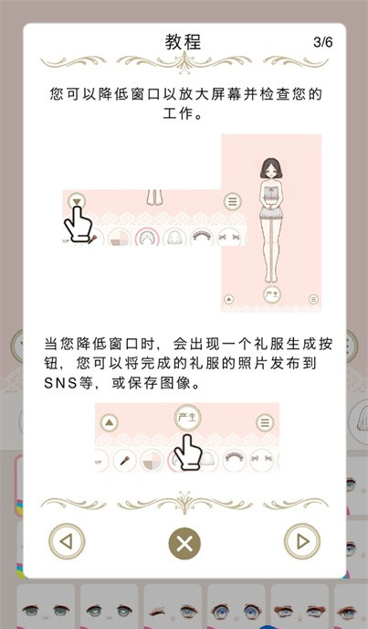 3、可以降低窗口以放大屏幕并检查工作,当降低窗口时,会出现一个礼服生成按钮,您可以将完成的礼服的照片发布到SNS等,或保存图像。