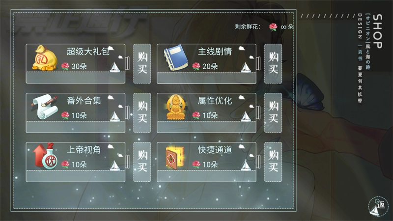 3、由于本游戏已经成功破解无限鲜花,我们可以打开鲜花商城直接购买超级大礼包、番外合集、主线剧情等物品。