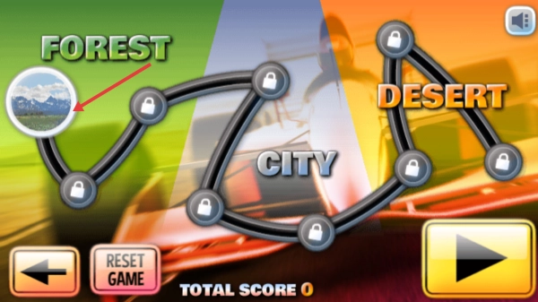 在赛道选择界面,优先选择已经解锁的【FOREST】森林赛道,点击【黄色播放按钮】即可开启比赛。