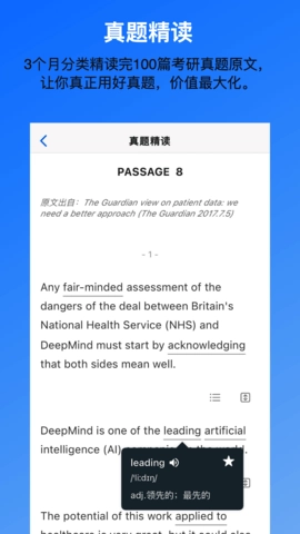 平台从近十年考研英语真题原文中精选出100篇,按照社会科学、自然科学等八大主题进行分类梳理,为用户提供逐篇精读以及深度解析的服务。