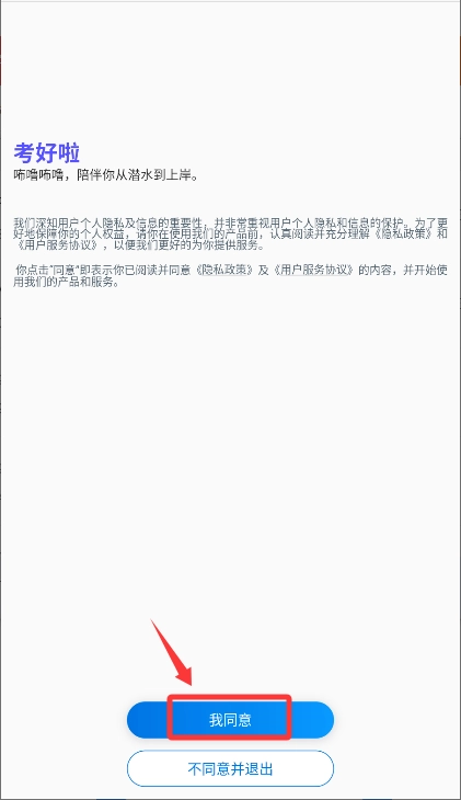 首次启动应用,请在隐私政策页面点击我同意进入。