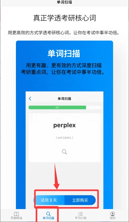 通过单词扫描选择试用或购买开启学习。