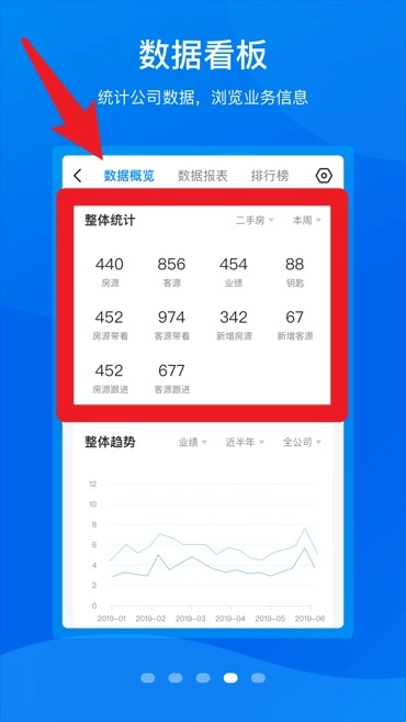 在数据看板里查看公司业务的统计及趋势数据,从而把握整体运营情况与业务发展方向。