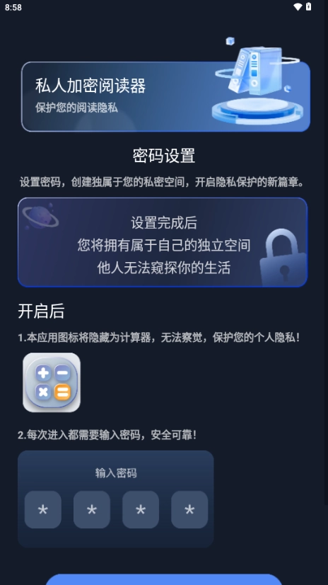 私人加密阅读器是一款本地小说阅读工具,用户可通过设置密码将其变为隐藏的阅读空间,还能自定义图标外观,打造专属的私密阅读环境,全方位守护你的小说阅读隐私。