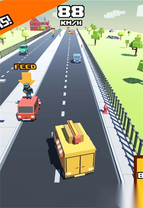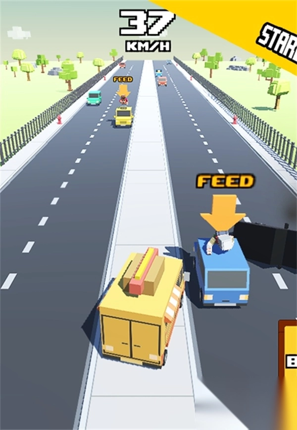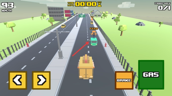 驾驶餐车时,通过【GAS】和【BRAKE】来控制速度,避开其他车辆,前往标注有【FEED】的目标点完成送餐任务。