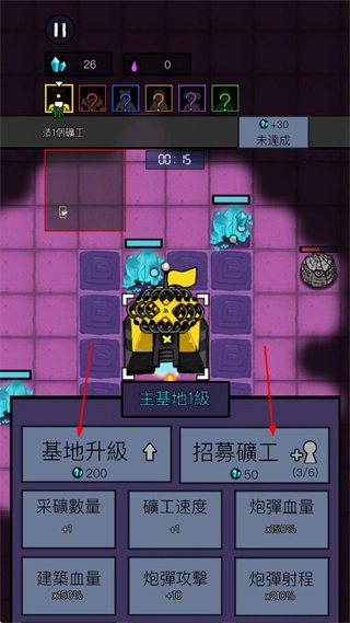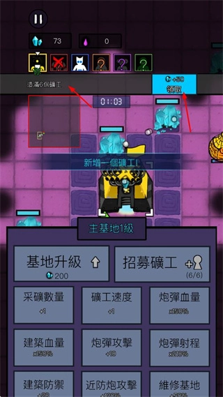 进入主基地界面后,你能够利用水晶资源对基地进行升级,以此来提升基地的各项属性;同时,你也可以招募矿工,从而增加采矿的人力。
