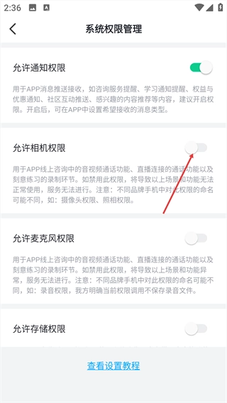 进入系统权限管理页面后,请开启【允许相机权限】这一权限。