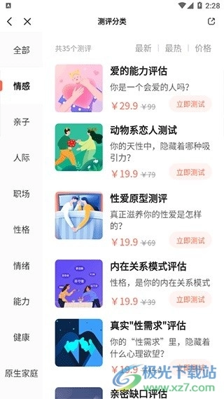 进入心理测评功能后,能看到有多种可进行测试的类型。
