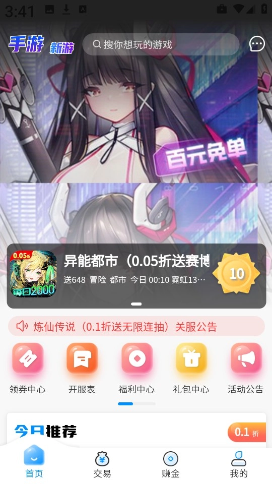 首页设有领券中心、开服表、福利中心、礼包中心、活动公告等一系列板块内容。