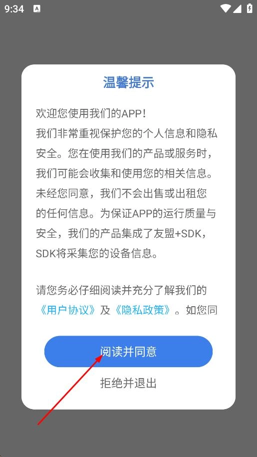 在温馨提示弹窗里,点击“阅读并同意”按钮,即可进入应用的首页。