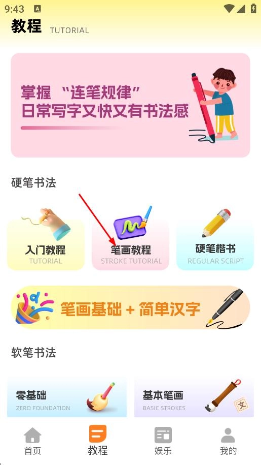 在教程页面,点击笔画教程选项,即可进入笔画教程的学习界面。