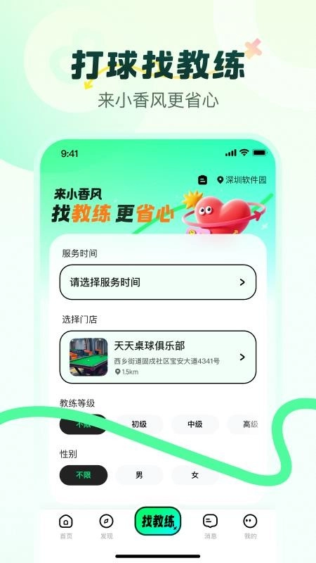 小香风聚焦台球爱好者的学习需求,以优质教练资源和便捷服务为核心,通过严格的教练认证机制确保服务品质,借助便捷的预约功能与线下精准指导优化用户体验,依靠科学的训练指导有效助力用户提升台球技术,是台球爱好者精进球技、畅享运动乐趣的得力辅助工具。