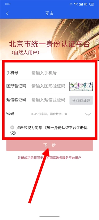 填写手机号码、图形验证码,获取并输入短信验证码,勾选相关协议后,点击“下一步”按钮,即可完成注册流程。