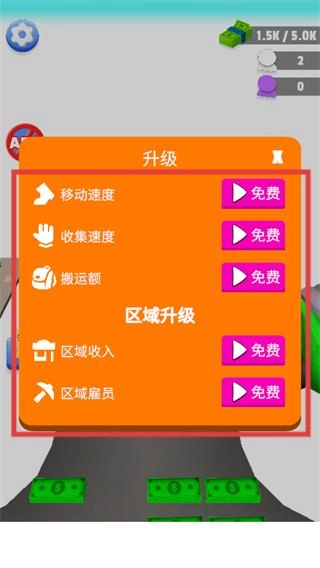 点击游戏内的升级界面,能看到移动速度、收集速度、搬运额等多种升级选项,借助升级可以提高小人的工作效率。