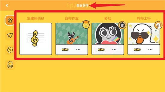在“自由创作”板块里,你既可以新建项目,也能浏览并播放已经完成的音乐作品。