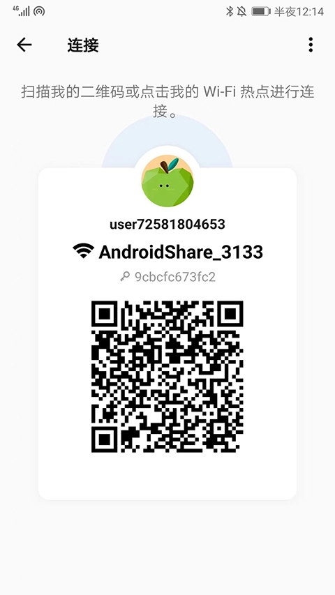 2、如图,已经生成了二维码,发送方通过扫描接收方的二维码或者点击wifi热点进行连接,