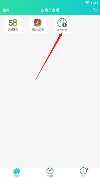 先打开应用分身版,进入首页后找到“添加应用”选项,点击该选项即可。