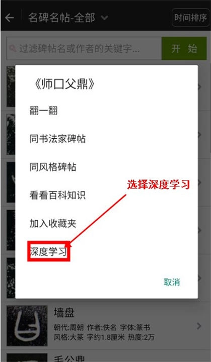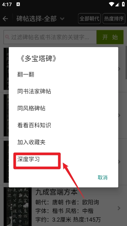 用户打开软件后,首先要选择一个书贴,接着点击界面最下方的“深度学习”按钮。