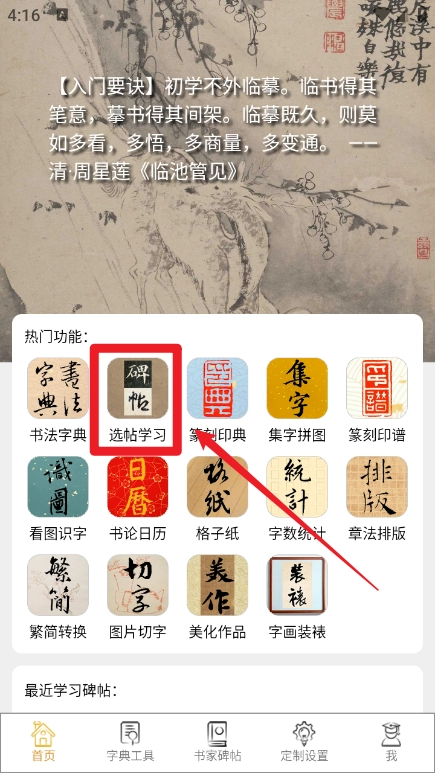 首先在本站安装不厌书法应用,安装完成后打开它,接着在首页找到并点击【选帖学习】按钮。