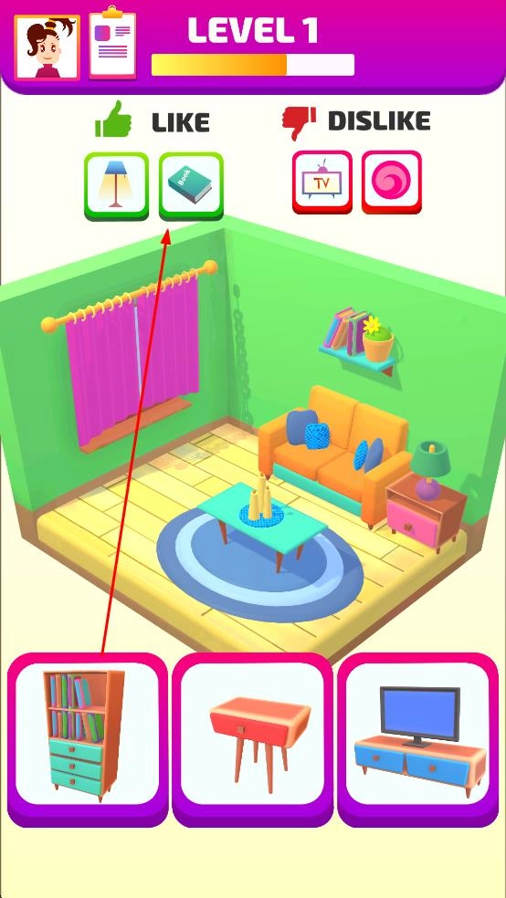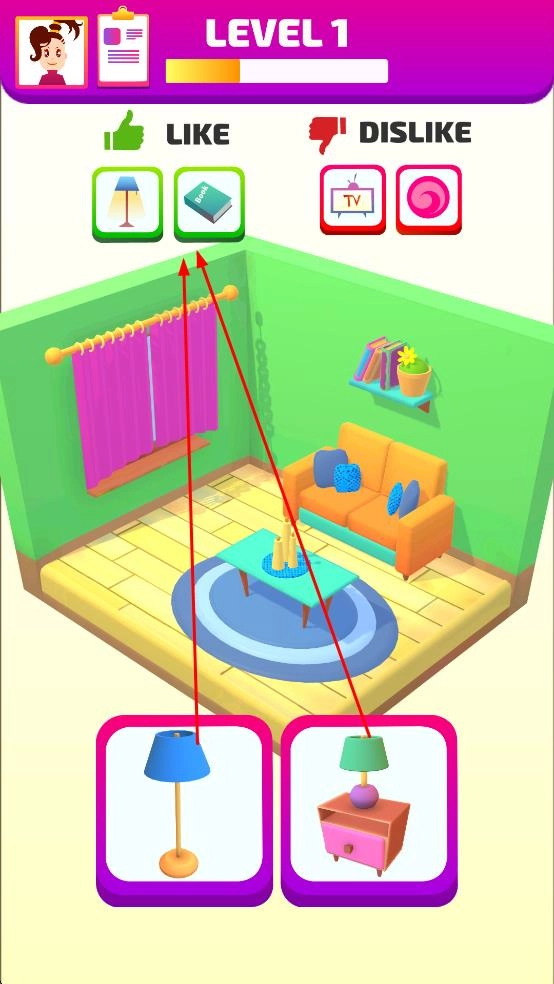 1. 在LEVEL1关卡里,依据上方所展示的喜欢与不喜欢的物品图标,挑选恰当的家具及装饰物品来布置房间。