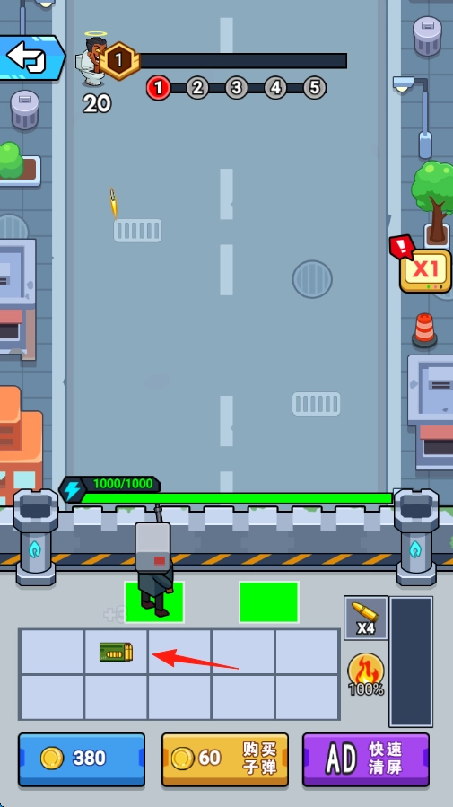 继续往前推进,依照箭头所指的方向,把路径上的僵尸清理干净,收集沿途的金币,给角色进行强化升级,完成各个关卡的挑战任务。