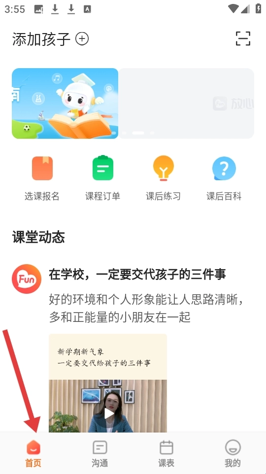 教育类首页支持添加孩子信息,页面设有选课报名等功能区域,课堂动态板块会展示各类教育相关内容,页面底部则配备了包含首页在内的导航栏。