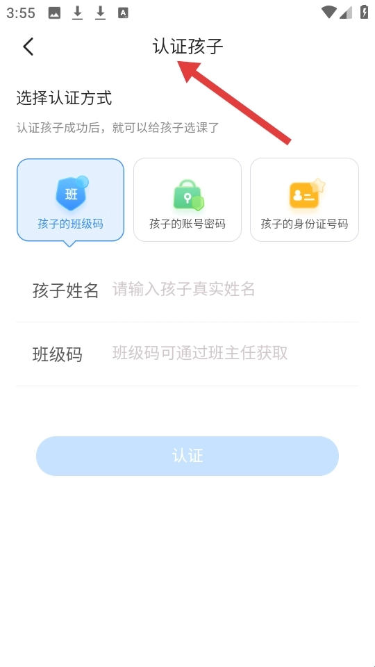 这是用于认证孩子身份的页面,标题部分明确提示认证孩子可采用班级码、账号密码等多种方式,完成认证后就能为孩子进行选课操作。