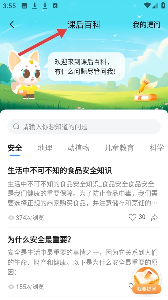 这个页面属于课后百科板块,设有可爱的卡通形象引导用户提问,展示涵盖安全、地理等多个领域的知识文章,并且支持用户自主提问。
