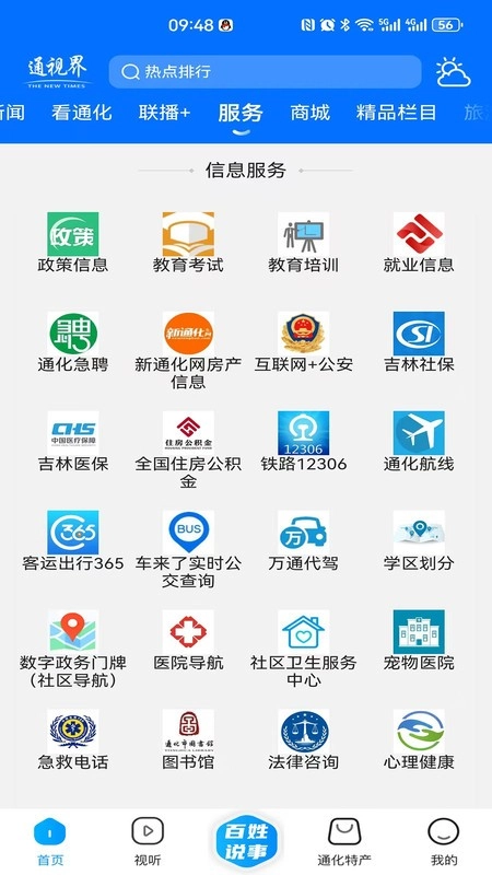 打开通视界后,首页上方能看到热点新闻、看通化、服务等板块内容。