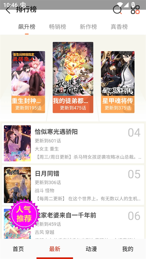 3、更新及时同步:与漫画官方发布渠道实时同步,热门连载章节24小时内更新,确保用户第一时间获取最新剧情发展。每日还会智能推送热门榜单和编辑精选内容。