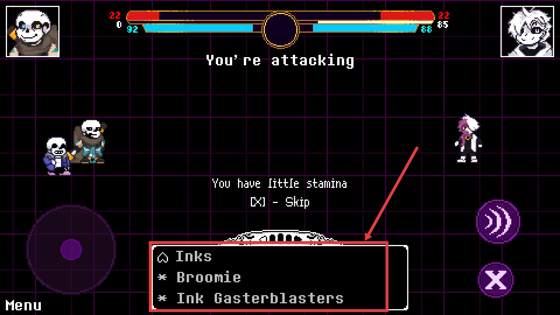 在发起攻击时,可以选用【Inks】、【Broomie】、【InkGasterblasters】这类技能,通过对技能进行合理的组合搭配,能够有效提高战斗的效率。