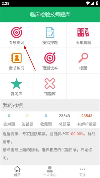 打开临床检验技师题库后,点击专项练习选项,就能进入专项练习的分类页面。