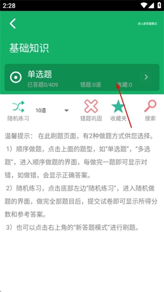 在基础知识题型选择页面,点击单选题即可进入单选题答题界面。
