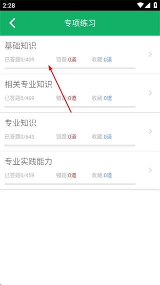 在这个页面上,点击“基础知识”选项,就能进入基础知识题型的选择页面。